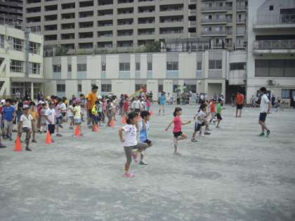 学校運営委員の皆様や、世田谷区スポーツ推進委員の皆様のご協力により、陸上競技を専門にしてる実業団の方々をお招きして、はやく走るための様々な運動を教えてもらいました。一つ一つの運動を真剣に行う子どもたちからは、運動会の短距離走で一位になるぞという気持ちが伺えました。教室の最後には運動会のコースを実際に走りました。