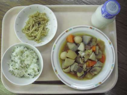 今日の給食は、「ワカメとジャコのご飯」「豚肉と大根のうま煮」「ゴマ酢がけ」「牛乳」です。ジャコには、骨を強くする働きがあります。