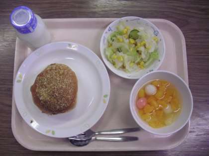 今日の給食は、「焼きカレーパン」「コーン入りフレンチサラダ」「紅白白玉ポンチ」「牛乳」です。