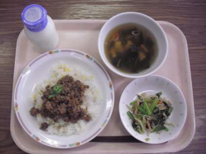 今日の給食は、「サバそぼろ丼」「すまし汁」「おひたし」「牛乳」です。
