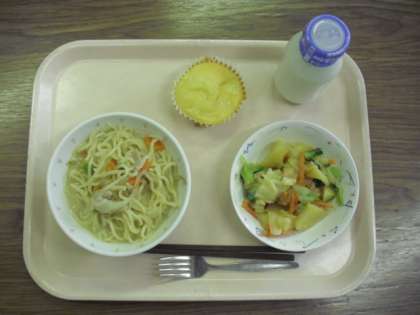 今日の給食は、「味噌ラーメン」「ジャガイモサラダ」「リンゴのヨーグルトケーキ」「牛乳」です。