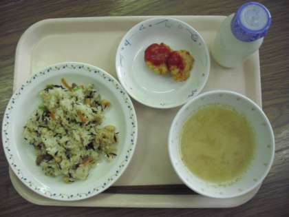 10月13日は「豆の日」です。「豆の日」にちなんで、今日の給食は大豆を中心とした「豆入りひじきご飯」「豆腐のナゲット」「きのこのみそ汁」「牛乳」にしました。