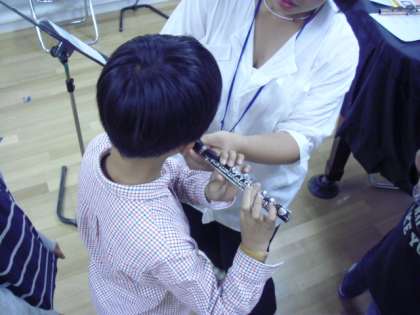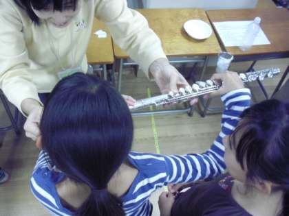 子どもたちは、フルートやクラリネットなどの木管楽器を手にし、音が出せるように練習をしました。音がでたときの喜ぶ姿が印象的でした。