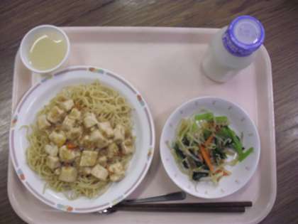 今日の給食は、「マーボー豆腐焼きそば」「ナムル」「リンゴゼリー」「牛乳」です。