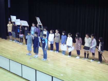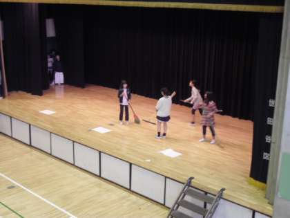 美化委員会は、ほうきや雑巾の正しい使い方などについて劇やクイズを使って発表しました。