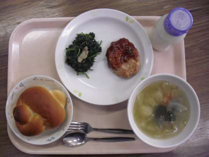 今日の給食は、「ミルクパン」「アップルチーズハンバーグ」「ほうれん草のソテー」「野菜スープ」「牛乳」です。