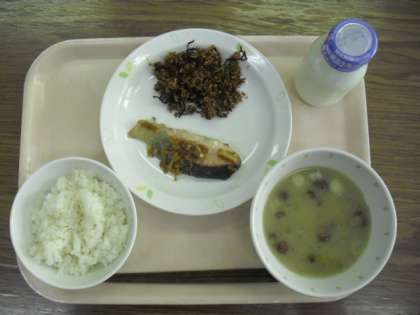 今日の給食は、「麦ごはん」「魚の南蛮焼き」「かみかみ佃煮」「なめこのみそ汁」「牛乳」です。