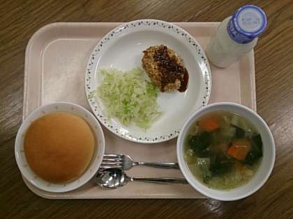 今日の給食は、「丸パン」「焼きコロッケ」「ボイルキャベツ」「野菜スープ」「牛乳」です。