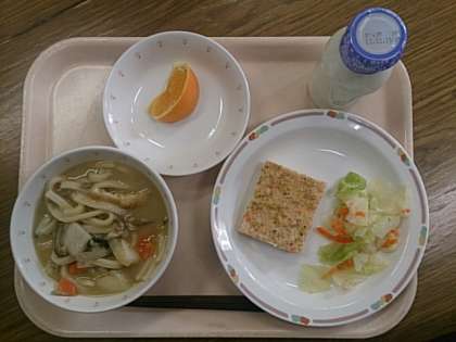 今日の給食は、「ほうとう」「松風やき」「野菜の甘酢がけ」「紅まどんな」「牛乳」です。