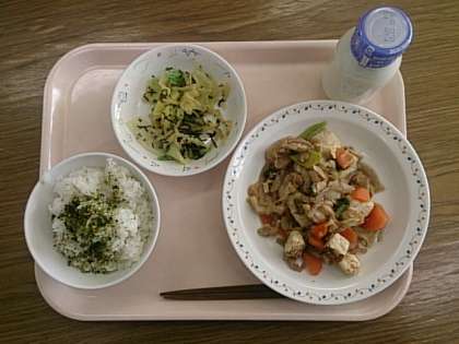 今日の給食は、「ごはん」「ふりかけ」「すきやき煮」「大根サラダ」です。