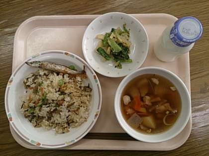 今日の給食は、「五目ごはん」「焼きししゃも」「白菜のごまだれかけ」「お雑煮」「牛乳」です。