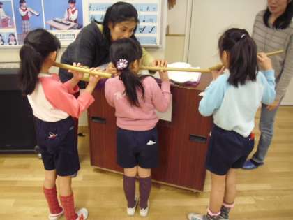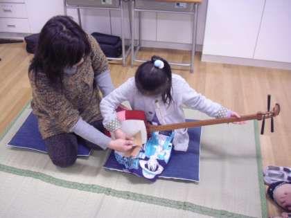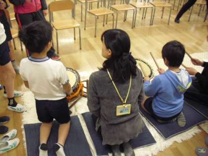 子どもたちは、篠笛、三味線、締太鼓などを実際に演奏し、和楽器に触れることができました。