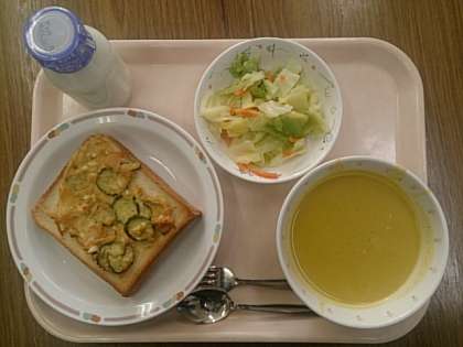 今日の給食は、「ツナトースト」「パンプキンポタージュ」「キャベツサラダ」「牛乳」です。