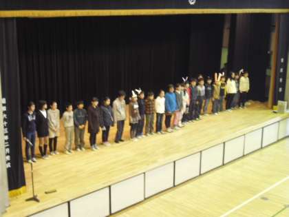 今日は、飼育委員会です。子どもたちはいくつかのグループに分かれ、飼っているウサギの名前や掃除の仕方などをクイズにして発表しました。