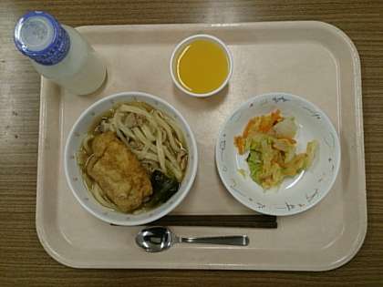 今日の給食は、「餅入りきつねうどん」「白菜のおかかかけ」「みかんゼリー」「牛乳」です。