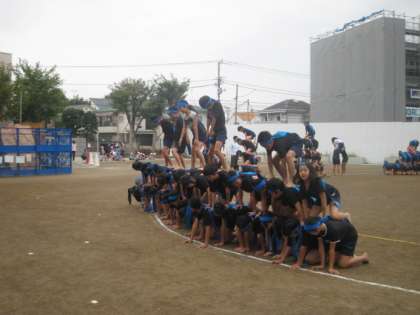 校庭で、黒い服を着て、ソーラン節の練習をしています。黒い服を着て踊るとかっこいいです。組体操も上手くなりました。当日をお楽しみに。