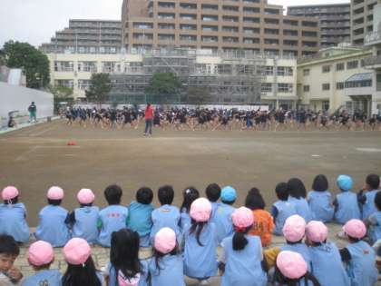 幼稚園の年長さんは、運動会でソーラン節を踊ります。5,6年生のお兄さんお姉さんたちが踊っている姿を見て、自分たちもがんばろうと誓いました。