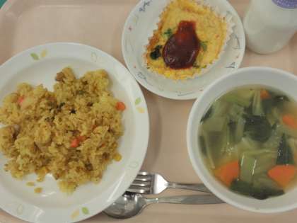 今日の給食は「メキシカンライス」「チーズ入り卵焼き」「野菜スープ」「牛乳」です。給食に毎日出ている牛乳には、体や骨を丈夫にしたり、気持ちを落ち着けたりする働きがあります。寒くなると残しがちになってしまいますが、少しずつでも飲んでほしい献立の一つです。