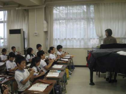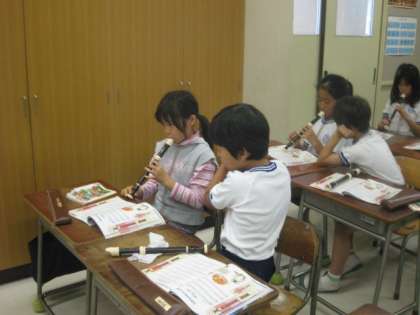 鹿島先生は、2年生と3年生の各クラスと4年生の2クラスの音楽を教えています。この日は、3年1組の音楽の授業でした。リコーダー吹いています。3年生で初めて覚えたリコーダーです。だいぶうまくなっていました。鹿島先生は、音楽の基礎を教ています。