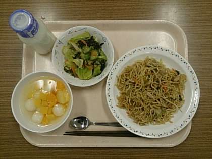 今日の給食は、「塩焼きそば」「ワカメサラダ」「フルーツ白玉」「牛乳」です。