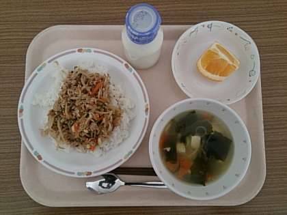 今日の給食は、「もやしのピリ辛味噌丼」「ワカメスープ」「スイートスプリング」「牛乳」です。