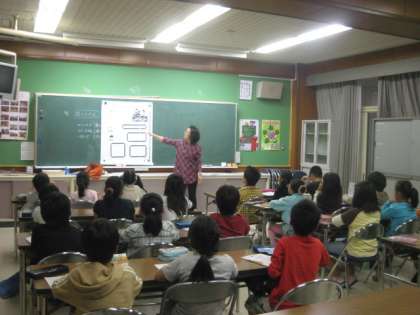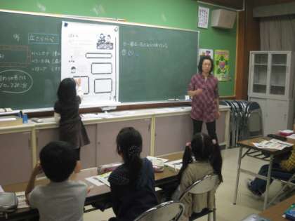 鈴木直子先生は、3年生の算数の授業のTTの先生と、4年生の2クラスの算数少人数の授業を担当しています。4年生1,2組の算数少人数の授業を見ました。面積の導入の授業です。広さ比べをして、面積の意味を理解します。しっかりした授業態度で、自分の考えをはっきり述べている4年生に感心しました。