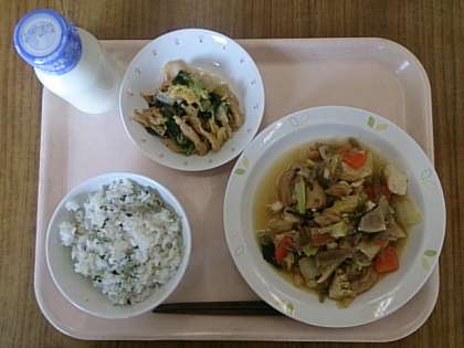 今日の給食は、「ワカメとジャコのご飯」「とりすき煮」「きのこ入り煮びたし」「牛乳」です。