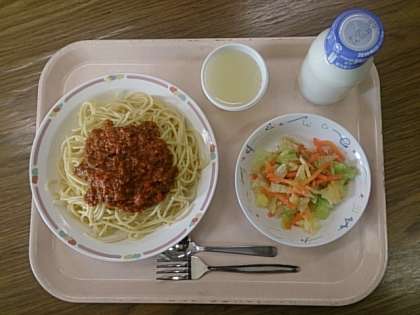 今日の給食は、「スパゲティミートソース」「ジャガイモのハニーサラダ」「リンゴゼリー」「牛乳」です。