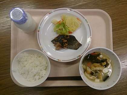 今日の給食は、「ごはん」「魚のしょうが風味焼き」「野菜の甘酢かけ」「みそ汁」「牛乳」です。