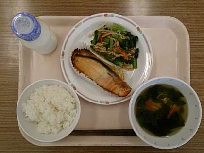 今日の給食は、「ごはん」「魚のみそマヨネーズ焼き」「おひたし」「すまし汁」「牛乳」です。