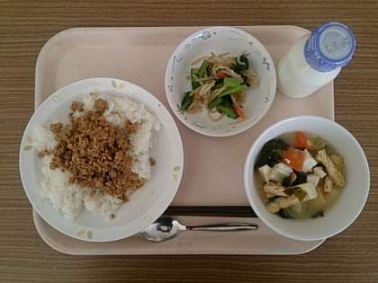 今日の給食は、「そぼろ丼」「野菜のからししょう油かけ」「白菜のみそ汁」「牛乳」です。