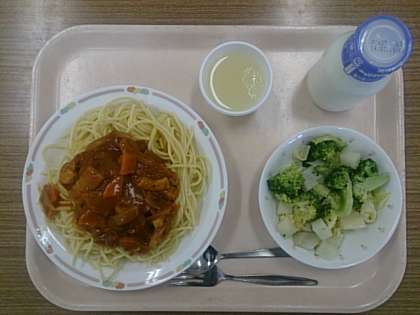 今日の給食は、「スパゲティ地中海ソース」「ブロッコリーのサラダ」「リンゴゼリー」「牛乳」です。