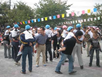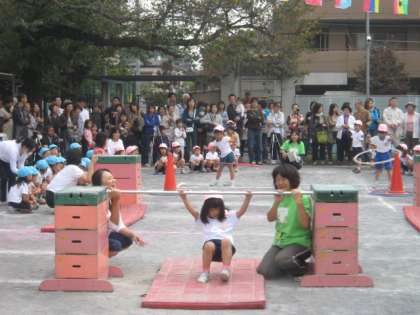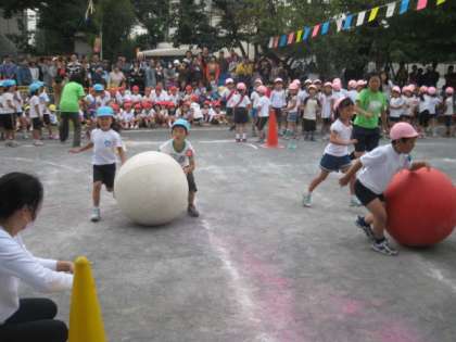 ガンバリマンになって、挑戦しました。力を合わせて大玉を転がしました。親子でゲットしました。たくましくなった年長さんでした。