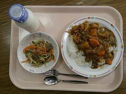 今日から給食が始まりました。メニューは、「カレーライス」「福神漬け」「こんにゃくサラダ」「牛乳」です。