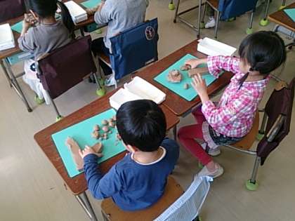 今日は図工の授業で粘土を使いました。子どもたちは、好きなものを作って楽しんでいました。子どもが作っていたもののベスト5は、「ぶどう」「飛行機」「電車」「ボール」「サイコロ」でした。