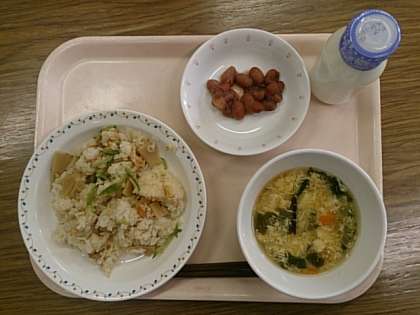今日の給食は、「たけのこごはん」「煮豆」「かきたま汁」「牛乳」です。かきたま汁には塚戸小学校の近くにある、「吉実園」でとれた卵を使って作りました。