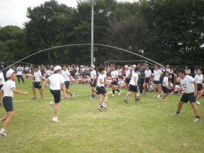 クラスごと、5分間で何回跳べるかを競います。各クラス、クラスの目標を目指してがんばります。クラスの団結力が高まります。全力を出しきって満足。保護者の方のたくさんの声援、ありがとう。