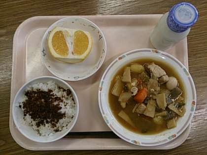 今日の給食は、「麦ごはん」「ふりかけ」「春野菜のうま煮」「美生柑」「牛乳」です。「春野菜のうま煮」には、「新じゃがいも、新たけのこ、ふき」など春の旬の野菜がたくさん入っています。