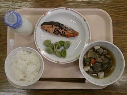 今日の給食は、「ごはん」「鮭の南部焼き」「塩ゆでそら豆」「けんちん汁」「牛乳」です。「塩ゆでそら豆」に使っているそら豆は、1年生が授業でさやむきをしました。