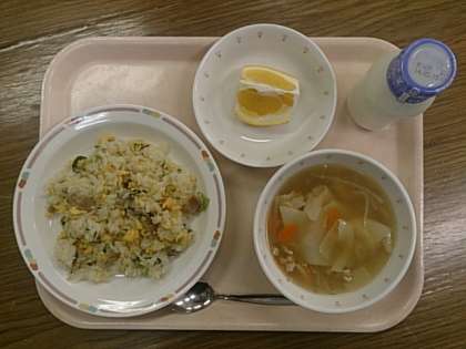 今日の給食は、「青菜のチャーハン」「ワンタンスープ」「美生柑」「牛乳」です。