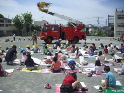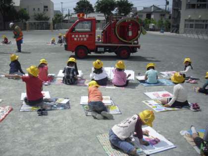 成城消防署の方々をお招きして、1年生が消防車の写生会を行いました。子どもたちはじっくりと消防車を眺めながら、自分らしさのあふれる消防車を描きました。