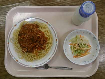 今日の給食は、「スパゲティミートソース」「ジャガイモのハニーサラダ」「牛乳」です。「ジャガイモのハニーサラダ」は人気のあるサラダメニューです。