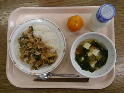 今日の給食は、「キムチ丼」「ワカメスープ」「冷凍みかん」「牛乳」です。