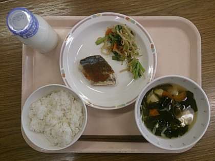 今日の給食は、「麦ごはん」「魚のバーベキューソース」「野菜のおかかかけ」「すまし汁」です。
