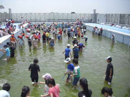 清掃前のプールにはヤゴがいっぱい。そのヤゴたちをプール清掃前に救い出すために水深を浅くしたプールへ入りました。網や虫かごを片手に子どもたちはヤゴとりに夢中になっていました。