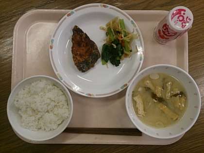 今日の給食は、「ごはん」「魚の竜田揚げ」「おひたし」「えのきのみそ汁」「ジョア」です。