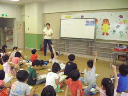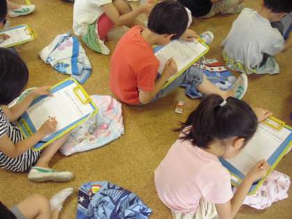 まずは、プールで地震が起こった場合にはどのような危険が発生するか、どのように行動したらよいかについて話し合いました。日頃の避難訓練等の積み上げから、多くの意見が子どもたちから出されました。