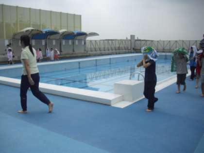 次に、プールから避難する方法について考えた後、実際に避難行動をとりました。こちらも日頃の指導の成果が十分発揮され、整然と避難ができました。