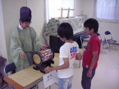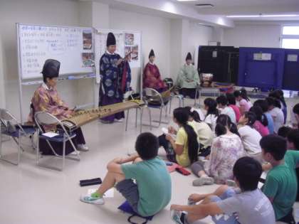 古くから伝わる箏(そう)・琵琶(びわ)・笙(しょう)・龍笛(りゅうてき)・鞨鼓(かっこ)・篳篥(ひきりき)を持ってきていただき、実際の演奏を聴きました。子どもたちは、音色に驚いたり、聞き入ったりしながら雅楽についての興味・関心を高めました。さらに、それぞれの楽器に触れ、演奏の仕方を学ぶ体験もすることができました。