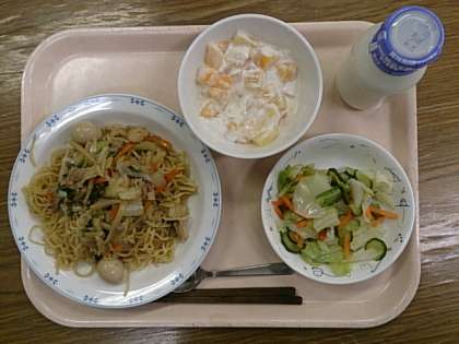 今日の給食は、「五目焼きそば」「野菜の甘酢かけ」「フルーツヨーグルト」「牛乳」です。